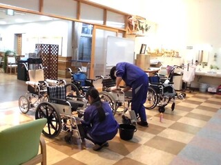 今年度も、三和区内の福祉施設清掃ボランティアを行っています。1回目は11月21日(金)、「特別養護老人ホーム三和愛宕の園」と「すいせんの里」に伺いました。生徒たちは、車いすに付着した汚れ、ベッドの脚まわり、食堂のテーブルまわりなど、普段職員さんが気になっているけれど、なかなか手が回らない場所を丁寧に磨きました。