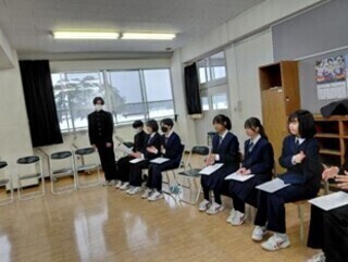参加者全員で記念撮影をした後、現生徒会から活動のふりかえりをしていただきました。春から一段と成長した3年生、全校生徒が積極的に参加してくれたこと、校内のボランティアに学年を越えて活動できて達成感があったこと、さんわ祭りでの体験が印象的だったことなど、ボランティアを通して、地域のあたたかさを知り、自己有用感を育んできたのだと感じました。